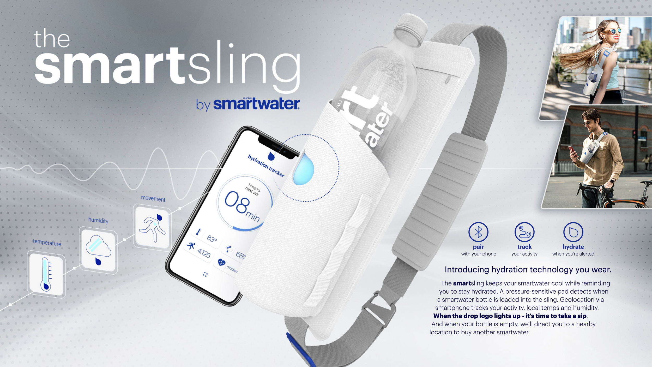 The Smart Sling idea was born from the insight that the smartwater bottle itself has become just as much of a fashion accessory, as it is a hydration solution.